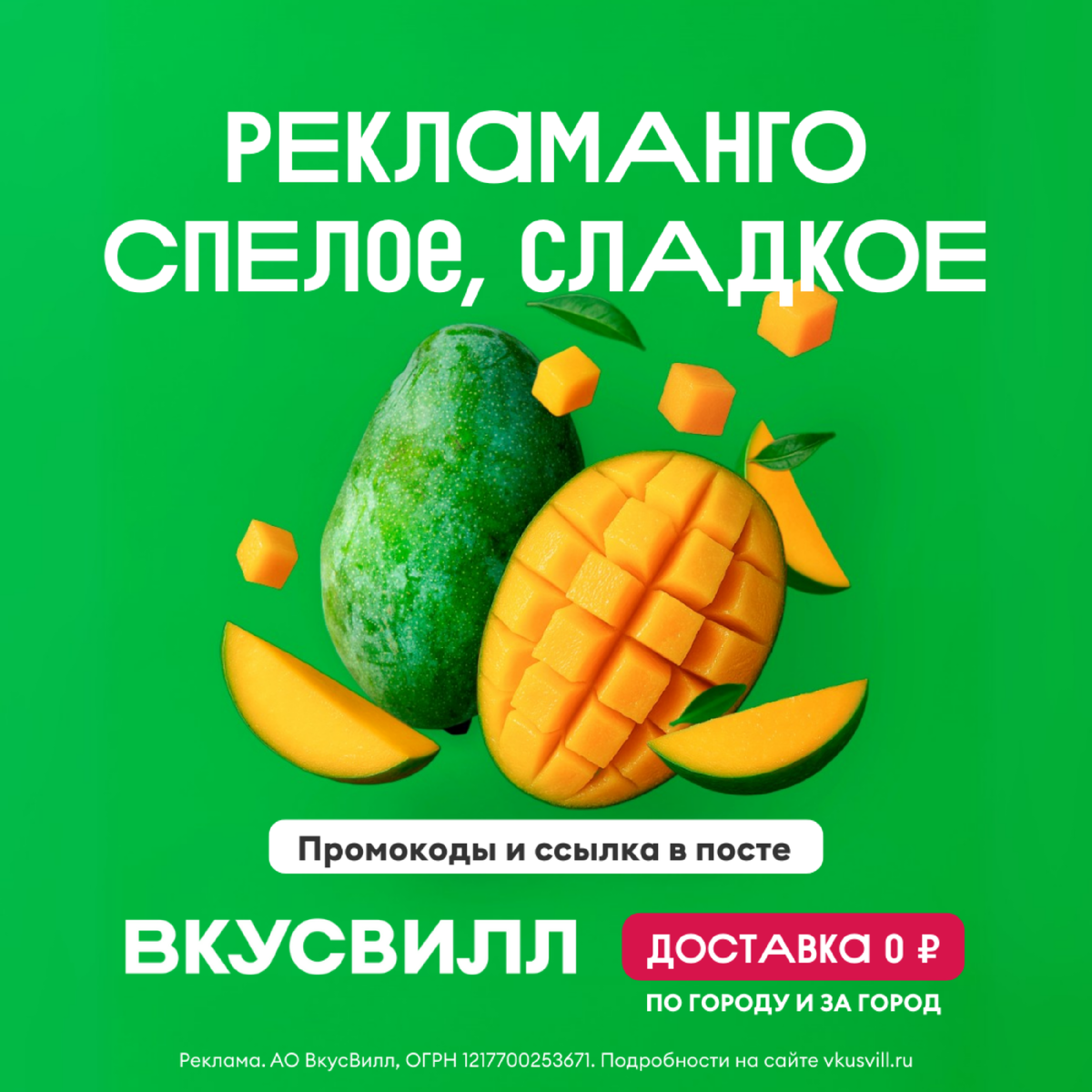 Египетское манго уже во ВкусВилле! Кто не знает про это потрясающее лакомство - вы многое теряете! Сладкое, без волокон, его хочется съесть целиком и не оставить ни кусочка. Заказывать рекомендую во ВкусВилле https://vksvl.prfl.me/6238cc608d70de4bf05c082d/63utfg?erid=2VtzqwHKe5g - у них всегда самый отборный урожай манго! Чтобы заказать выгодно используйте промокод на первый заказ: скидка 250 ₽ от 1250 ₽ на первый заказ -- VS58AE1 скидка 300 ₽ от 1500 ₽ на первый заказ -- 30V5D95 скидка 350 ₽ от 2500 ₽ на первый заказ -- 35V7F67 ВкусВилл привезет ваш заказ бесплатно, доставка по городу не займет более 2х часов. Также есть доставка за город! Реклама. АО ВкусВилл, ОГРН 1217700253671. Подробности на сайте vkusvill.ru