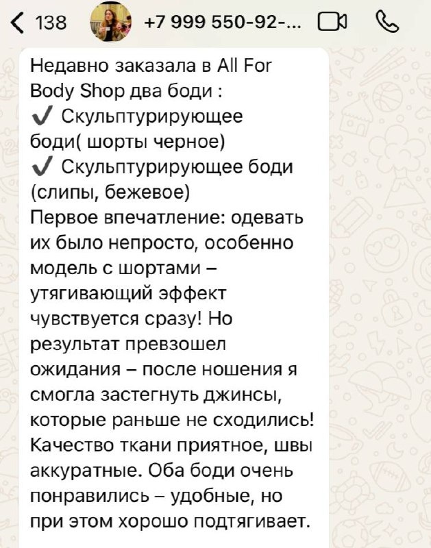 Ваша ежедневная обратная связь 💚 Чаще всего наши покупательницы берут для себя сразу ДВА БОДИ - слипами и шортами 💫 «…особенно модель с шортами - утягивающий эффект чувствуется сразу! Но результат превзошел ожидания - после ношения я смогла застегнуть джинсы, которые раньше не сходились! Качество ткани приятное, швы аккуратные..» 🤠 Еще больше отзывов: #afbshop_обратнаясвязь Наше боди SCULPT: 💗плотно прилегает к телу, не оставляя «выпирающих» боков. 💗позволяет коже дышать, обеспечивая комфорт в течение всего дня. 💗ПОТРЯСАЮЩЕ держит грудь и даже без белья! 📱 Узнать подробности и оформить заказ через телеграм: @AllForBody_bot 🤩ИЛИ НА НАШЕМ САЙТЕ: https://afbshop.ru