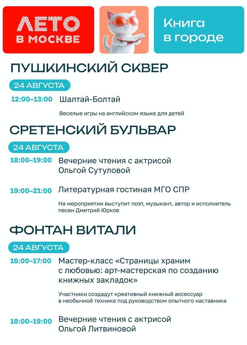 🆓Вечерние чтения, мастер-классы, литературная гостиная от @Moscow2030Culture 🗓️24 августа 📍фонтан Витали, Сретенский бульвар Пока выходные не закончились, нужно успеть насладиться ими как следует. Присоединяйтесь к активностям проекта «Книга в городе»! Сыграем в веселые игры на английском, создадим закладку для книг своими руками на мастер-классе, посетим литературную гостиную и встретимся с актрисами Ольгой Литвиновой и Ольгой Сутуловой на вечерних чтениях. 🆓Бесплатно Подробнее ЗДЕСЬ @Together_with_kids Пост носит информационный характер