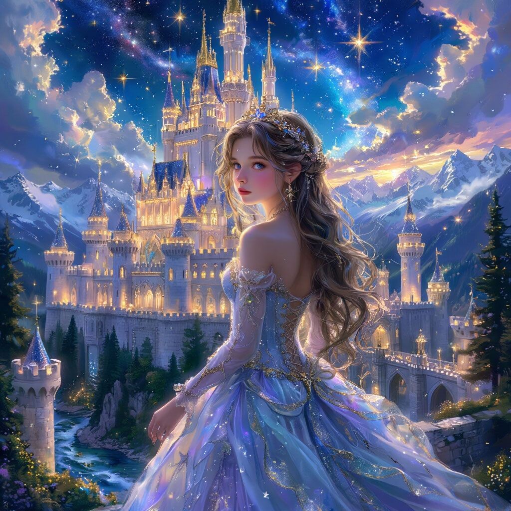В королевстве, где горы касались облаков, а реки сверкали как серебряные ленты, стоял удивительный замок. Его стены были сделаны из прозрачного хрусталя, а башни украшены золотыми звёздами, которые мерцали даже днём. В этом замке жила принцесса Селеста — девушка с волосами цвета ночного неба и глазами, похожими на два драгоценных сапфира. Селеста обладала невероятным даром: она могла управлять магией света. Когда она поднимала руки, вокруг неё появлялись маленькие светящиеся огоньки, похожие на светлячков. А её голос был настолько волшебным, что мог превращать обычные камни в драгоценные кристаллы. Однажды в королевство пришла беда. Тёмный колдун Морталис, завидуя силе принцессы, наложил заклятие на замок. Хрустальные стены стали тускнеть, а звёзды на башнях погасли. Но Селеста не испугалась. Она знала, что в глубинах замка спрятан древний артефакт — Кристалл Истинного Света. Принцесса спустилась в подземелье, где свет не проникал никогда. Там, в самом сердце тьмы, она нашла кристалл,