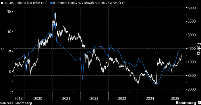 Инвесторы агрессивно покупают акции с «плечом», игнорируя слабую экономику, которая испытывает давление из-за торговой войны и глубокого кризиса на рынке недвижимости. Белым — индекс CSI 300 (правая шкала), голубым — денежная масса M1 в Китае (изменение % г/г, левая шкала). Источник: Bloomberg Китайская экономика испытывает давление из-за торговой войны и глубокого кризиса на рынке недвижимости. Однако фондовый рынок страны продолжает бычий тренд, и это несоответствие вызывает сомнения в устойчивости ралли. Только за последний месяц рыночная стоимость акций на внутреннем рынке Китая выросла почти на триллион долларов, индекс Shanghai Composite достиг максимума за десятилетие, а индекс CSI 300 поднялся более чем на 20% с минимумов года. Это происходит на фоне того, что почти каждый последний экономический индикатор — от тенденций в потреблении и цен на жилье до инфляции — вызывает тревогу у инвесторов. «Рынки, возможно, ожидают — правильно или ошибочно — улучшения макроэкономических пок