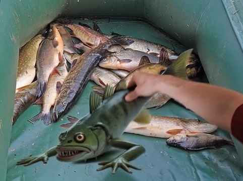 Эта история произошла совсем недавно. Двое мужчин рыбачили в Васюганских краях, где щуки — пруд пруди. Не первый год они там рыбачат. Вскоре друзьям надоело кидать спиннинг, они решили разнообразить свою рыбную охоту и поставили несколько сетей. Первую сеть проверили, сняли много щуки. А когда на лодках подъезжали ко второй сети, поплавки словно сходили с ума: сеть буквально подпрыгивала на полтора метра в высоту над озером. Друзья не поняли, что это такое, и быстрее начали грести к сети. А когда они принялись её проверять, то вытащили нечто необычное, нечто похожее из какого-то фантастического фильма. Рыбаки вытащили из сети странную рыбу: окрасом похожую на окуня, пасть с огромными острыми зубами, которые торчали чуть ли не наружу. Но самое главное, у этой рыбы впереди, около головы, имелось по две лапы, похожие на лягушачьи, только намного мощнее и больше. Что это за чудо природы или сбой в генетике, рыбаки не понимали. Вскоре они забрали всю рыбу и, конечно, пойманный странный троф