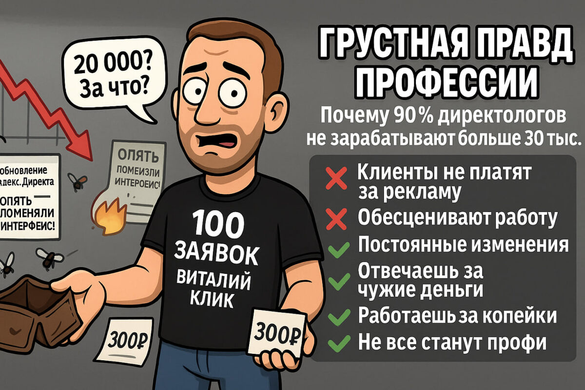 Если верить «экспертам» в интернете, профессия директолога — это лёгкий путь к деньгам: прошёл курс, взял пару клиентов, и вот уже сотни тысяч на карте. Реальность совсем другая. Есть правда, о которой редко говорят. Но именно она определяет, задержитесь вы в профессии или вылетите через пару месяцев. Новички думают: «Моя задача — настроить Яндекс.Директ». Но клиенту это не нужно. Ему нужны деньги, а не клики, показы или красивые отчёты. Можно принести 200 дешёвых заявок по 300 рублей, и всё равно услышать: «Рекламщик плохой». Потому что из этих заявок никто не купил. 👉 Итог: если не понимаешь бизнес-процесс клиента — ты всегда будешь «специалистом за копейки». Ты можешь сутками сидеть в рекламных кабинетах, анализировать, тестировать гипотезы и связки, готовить отчёты.