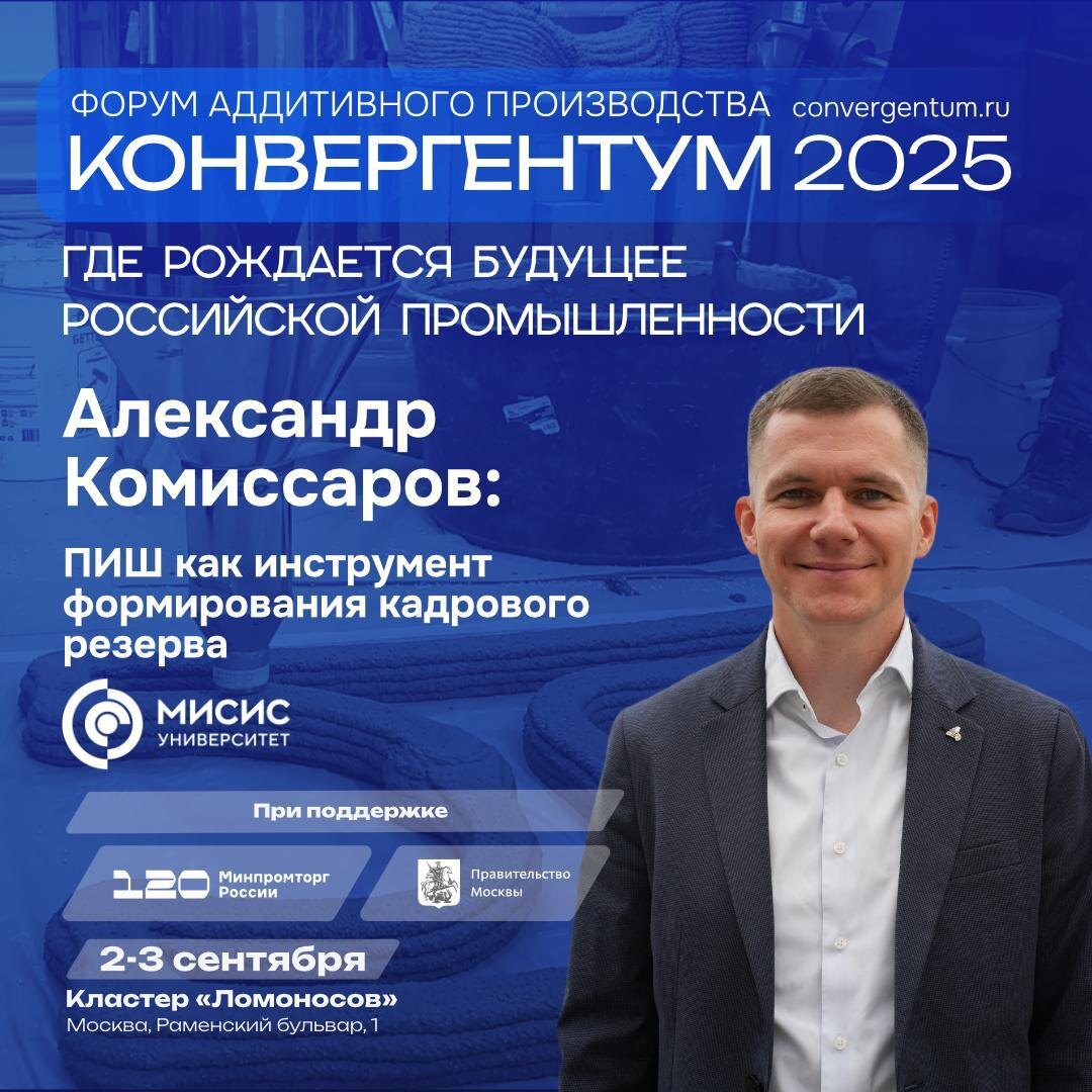 Александр Комиссаров: ПИШ как инструмент формирования кадрового резерва 👤 Директор Передовой инженерной школы (ПИШ) МИСИС Александр Комиссаров представит доклад «ПИШ МИСИС как инструмент формирования кадрового резерва в области аддитивных технологий» на Форуме аддитивного производства «Конвергентум 2025». В своем выступлении он раскроет, как ПИШ МИСИС готовит инженеров нового поколения через интеграцию науки, образования и реальных производственных задач. Гости форума узнают о проектах студентов — от биомедицинских имплантов до высокотехнологичных материалов для промышленности, а также о роли партнерств с ведущими компаниями, такими как Росатом. Доклад будет полезен представителям бизнеса, вузов и молодым специалистам, заинтересованным в развитии аддитивных технологий в России. 📲 Спешите зарегистрироваться на официальном сайте convergentum.ru. Получите уникальные идеи и практические инструменты для развития вашего бизнеса с помощью современных аддитивных технологий. 🌐 Место: Мо