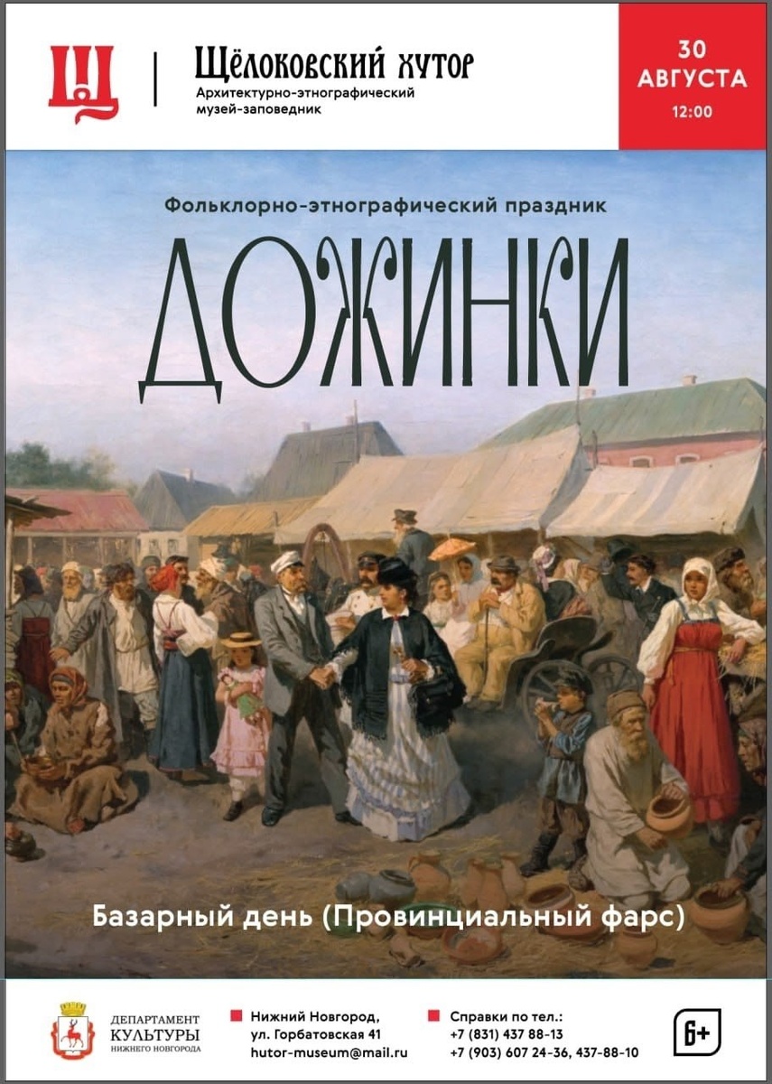 30 августа 2025 года в 12:00 ч. фольклорный праздник «Дожинки»! Яркое празднество посвященно окончанию лета и первому урожаю. Гостей ждёт погружение в традиции сельской жизни к. XIX – нач. XX веков Провинциальный фарс «Базарный день» - забавное представление о нравах и быте небольшого городка конца XIX – начала XX века, старинные обряды, посвящённые завершению жатвы. Фольклорные коллективы песнями и танцами создадут атмосферу настоящего деревенского праздника. Стоимость билетов: взрослый – 500 руб., льготный – 300 руб., школьный – 200 руб., дети до 6 лет – бесплатно. Музей деревянного зодчества "Щелоковский хутор" ул. Горбатовская, 41 😄 Мероприятия Нижний Новгород. Я местный!