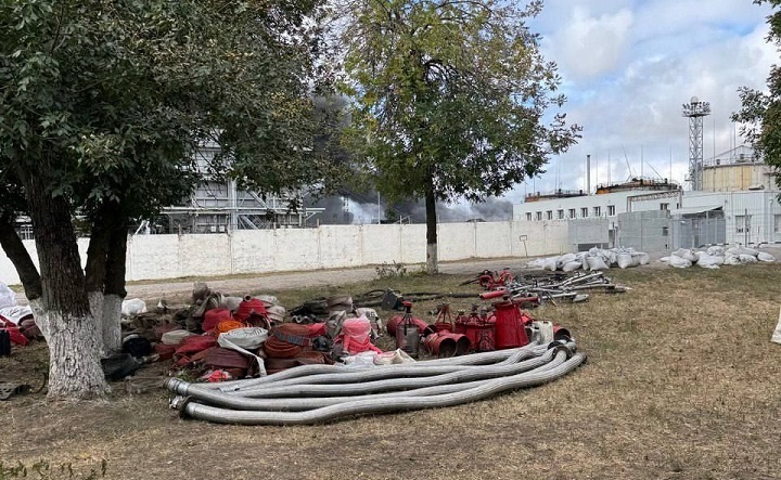Врио губернатора Юрий Слюсарь Ростовской области официально сообщил, что четвёртые сутки после атаки БПЛА горит Новошахтинский завод нефтепродуктов. По его словам, площадь пожара, который начался ещё 21 августа, на данный момент удалось сократить. «Сил и средств для тушения хватает. Помогают сотрудники МЧС из Краснодарского края, Калмыкии, Волгоградской и Московской областей. Всего в ликвидации ЧС задействовано 412 человек и 150 единиц техники. Для тушения пожара дополнительно привлекались два пожарных поезда, сейчас задействован только один», — написал он. Пока без воды остаются около 8 тысяч жителей Красного Сулина и нескольких посёлков. Для них организован подвоз воды. Руководитель регионального управления Роспотребнадзора Евгений Ковалев сообщил, что специалисты постоянно мониторят состояние воздуха. Ни одна проба, по его словам, не выявила превышение концентрации вредных веществ. Обстановка на месте пожара. Фото из telegram-канала Юрия Слюсаря Минувшей ночью силы ПВО уничтожили но