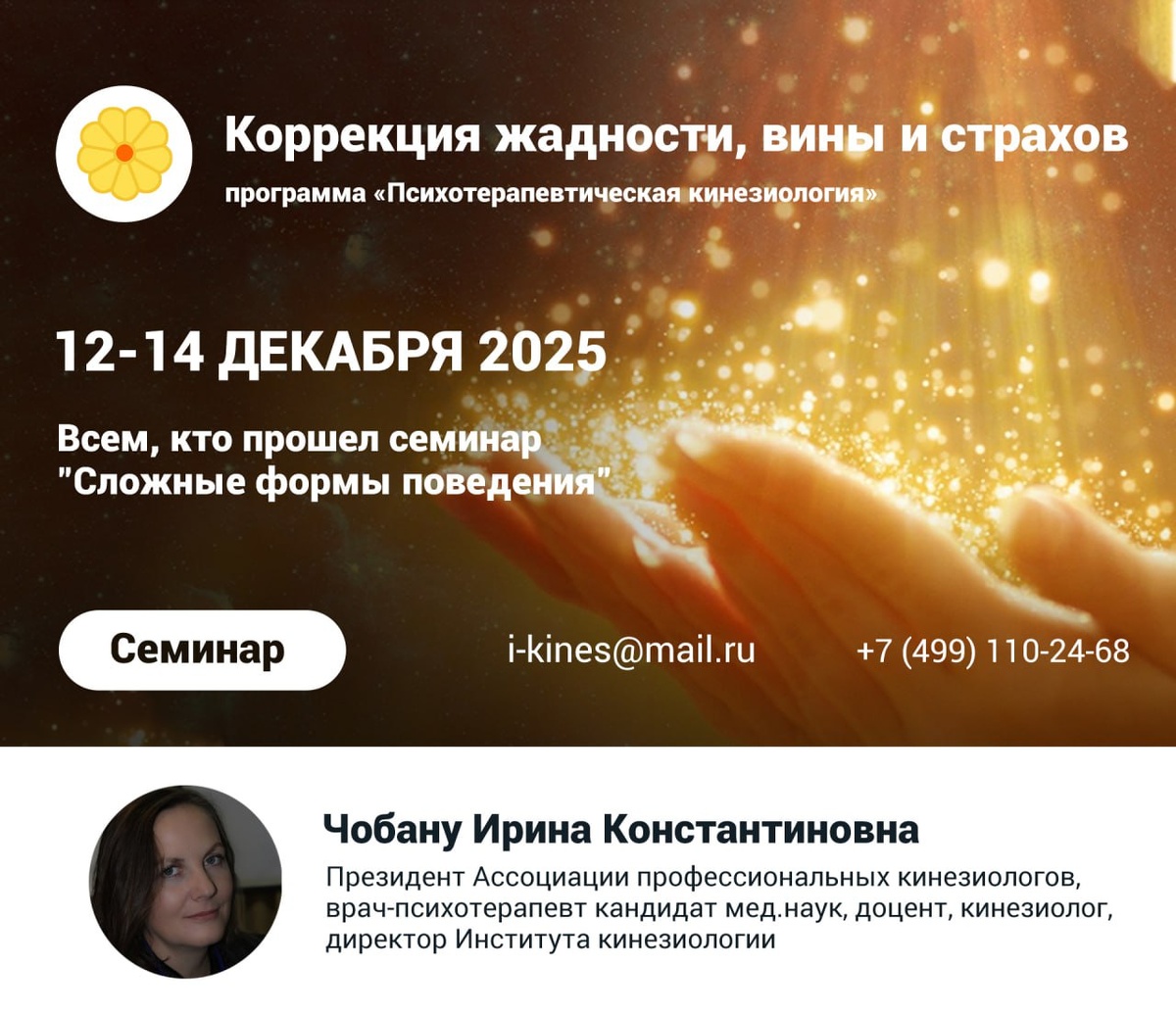 Дорогие друзья!🌿 Приглашаем Вас на семинар "Коррекция жадности, вины и страхов", который будет проведен с 12 по 14 декабря 2025 года Семинар проводит Чобану Ирина Константиновна — кинезиолог, инструктор ПТК, врач-психотерапевт, президент АПК и Института Кинезиологии 😔 Сейчас в нашем обществе потребления - жадность незаметно стала главным движущим мотивом. И это страшно. ✅ На этом семинаре мы научимся противостоять жадности, а также мы поговорим и поработаем с темой насилия и вины 💫 Изучим мягкий, безопасный вариант работы с воспоминаниями о насилии и с чувством вины Подробнее о семинаре можно узнать в личных сообщениях группы ВК или по ссылке — https://kinesioportal.ru/events/2528/15322.php