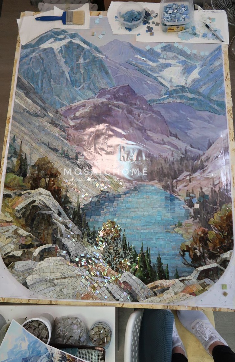 Панно "Пейзаж" Продолжение работы Чтобы точно передать цвет и рисунок, мы выбрали мозаику из разных коллекций. Использовали чипы размером 15х15 и 20х20. Разнообразие мозаики позволило сделать цветовые растяжки плавными, а изображение — насыщенным
