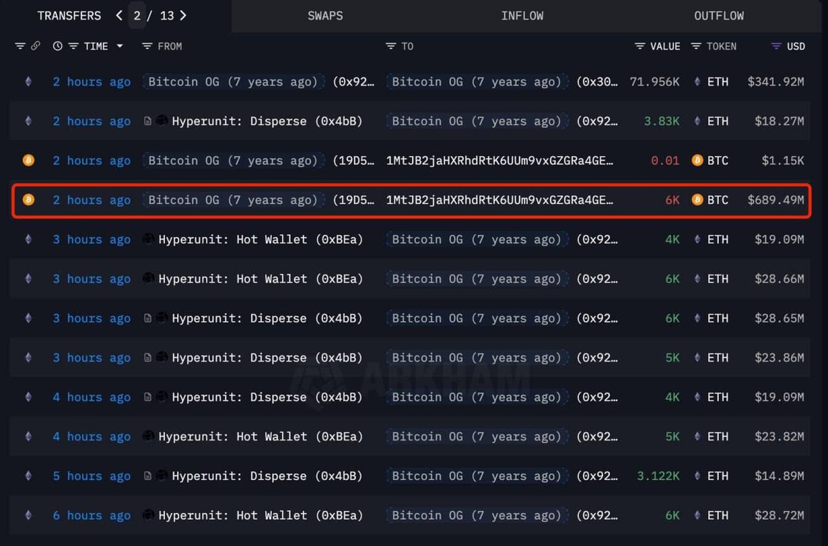 Bitcoin OG перевел еще 6 000 $BTC (689,5 млн долларов) на покупку $ETH