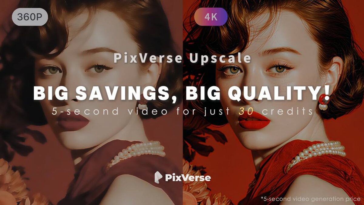 PixVerse Upscale: большая экономия, отличное качество Теперь вы можете масштабировать 5-секундное видео всего за 30 кредитов (ранее было 50 кредитов). 🔴Высококачественное улучшение видео: увеличение разрешения без потери деталей 🔴Просто и быстро: повысьте качество своего видео всего за несколько кликов, сократив время обработки на 60% 🔴Доступное творчество: более мощные инструменты по более низкой цене. Тестить тут #новости@dailyprompts