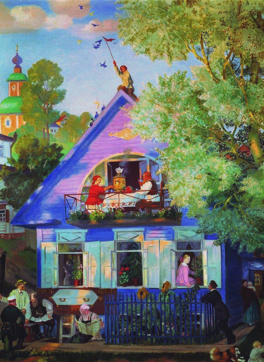 Кустодиев создал целую модель мироздания, заключённую в образе русского дома. Каждый этаж здесь — этап человеческой жизни, а каждая фигура — символ.