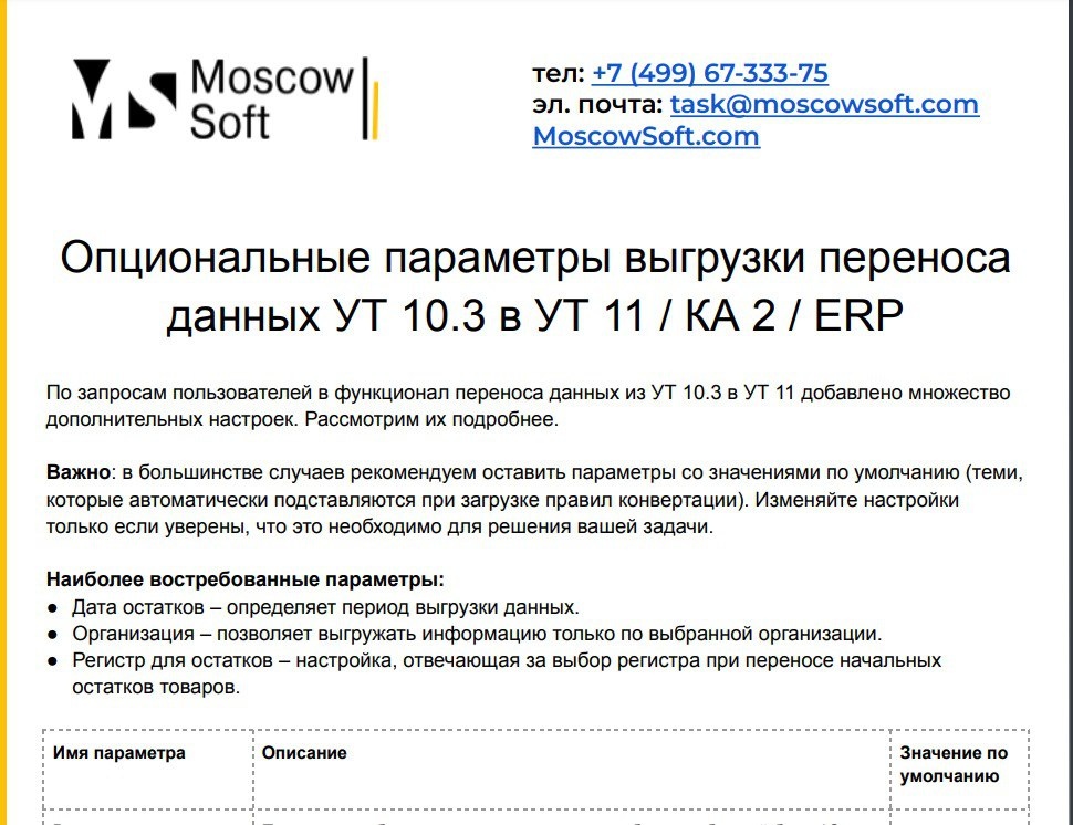 Здравствуйте, уважаемые подписчики! 🎉 Хотим поделиться с вами таблицей опциональных параметров переноса данных из 1С:УТ 10.3 в 1С:УТ 11, 1С:КА 2 или ERP. Таблица доступна в Telegram и станет незаменимым помощником для всех, кто занимается переносом данных 1С. 📥 Скачать таблицу можно здесь: Список опциональных параметров переноса данных из 1С УТ 10.3 в УТ 11 / КА 2 / ERP 🔔 Подписывайтесь на наш Telegram-канал, чтобы не пропускать важные обновления и полезные материалы!