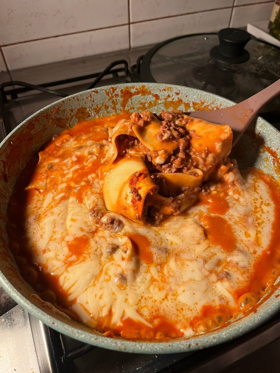 На просторах соцсетей сейчас гуляет рецепт «ленивой лазаньи», и мне тоже захотелось попробовать. Но будем честными: если в макароны добавить фарш, сыр и томатную пасту — как бы это ни назвать, всё равно получится вкусно. В тот день у нас ещё отключили электричество. И то, что именно тогда я решила готовить это блюдо, оказалось очень кстати. Ингредиенты: • 500 г говяжьего фарша (у меня домашний, с луком) • 250 г протёртых томатов или томатной пасты • 100–150 г тёртого сыра (сыром лазанью не испортишь) • 100 г листов лазаньи (в пачке 250 г — хватит на два блюда) • 300 мл воды • соль по вкусу Как готовить: • обжариваем фарш, постоянно помешивая, чтобы не было комков • добавляем протёртые томаты, солим • листы лазаньи разламываем на 3–4 части и отправляем в сковороду • заливаем водой так, чтобы листы были погружены (я перелила, пришлось выпаривать дольше) • накрываем крышкой и тушим, пока паста не станет мягкой • когда вода выпарилась, сверху посыпаем сыром и ждём, пока он расплавится П