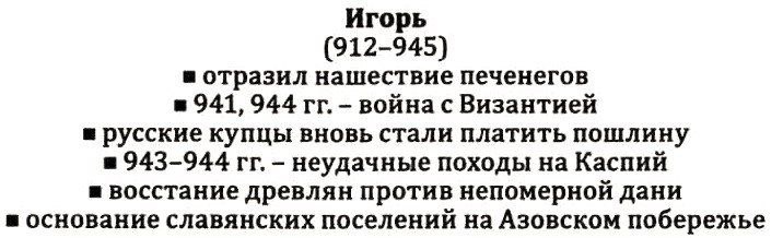 Князь Игорь До 912 года Киевской Русью правил князь Олег от имени Игоря, поскольку последний был еще совсем юным. Будучи от природы и воспитания скромным, Игорь уважительно относился к старшим и не смел предъявлять свои права на престол при жизни Олега, который за свои дела окружил свое имя ореолом славы. Князь Олег одобрил выбор жены для будущего правителя. Киевский князь Игорь женился в 903 году на простой девушке – Ольге, жившей вблизи Пскова. Начало правления После того, как умер Олег, Игорь стал полноправным князем Руси. Его правление началось войной. В это время племя древлян решило выйти из-под власти Киева и началось восстание. Новый правитель жестоко покарал восставших, нанеся им сокрушительное поражение. Этим сражением начались многочисленные походы князя Игоря. Результатом похода на древлян стала безоговорочная победа Руси, которая на правах победителя потребовала с восставших дополнительную дань. Следующие походы были направлены на противостояние с печенегами, которые, из