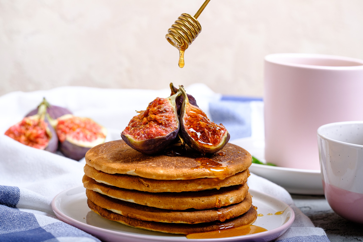Время инжира. Он отлично подходит к сладким и несладким блюдам. С панкейками он создаёт фруктовую нотку. Мед и инжир добавляют сладости, так как на тесто используется мало сахара. Сегодня мы готовим сладкие американские оладьи - панкейки. Самое большое отличие от обычных оладушек в том, что готовят большой толстый блин по одному на сковороде, не смазывая ее маслом. Совет: Для максимальной пышности панкейков рекомендуется использовать холодное молоко прямо из холодильника. Приятного аппетита! Другие рецепты блинов и оладьев в подборке: