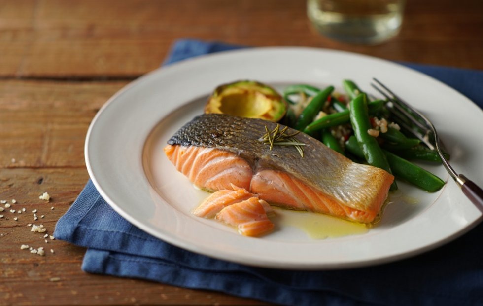- Запеченная рыба с салатом из свежих овощей, заправленным лимонным соком.