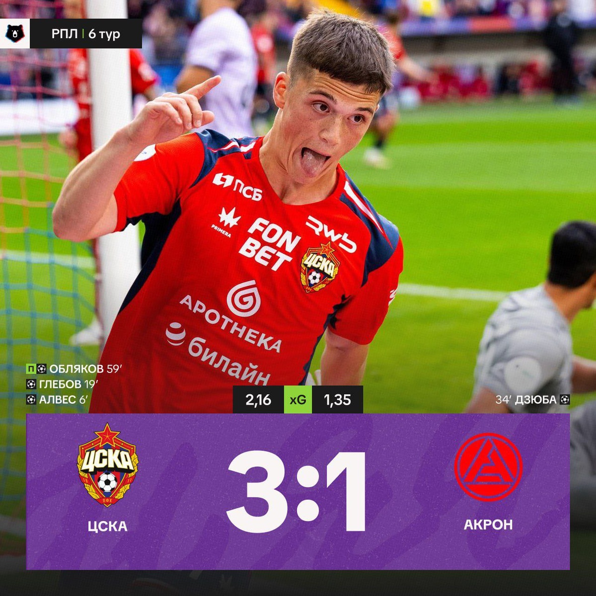 ЦСКА обыграл «Акрон» и ворвался в топ-2 РПЛ🇷🇺👊 Алвес забил во второй игре кряду, у Глебова 1+1, а Руис и Виктор дебютировали за армейцев. Команда Челестини все еще без поражений. Дзюба забил третий гол в РПЛ. Тольяттинцы с июля не побеждают в чемпионате.