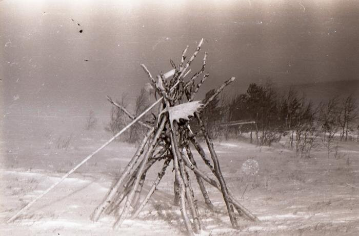 В этой статье снова хочу вернуться к тому «чуму», который был обозначен на карте поисковиками. Вернее сказать, сегодня можно только предполагать, что там был чум. Я где – то читал что Масленников объяснял, что там было. Там стояли жерди от летнего чума. Но это крайне сомнительно, потому что манси не оставляют жердей. Они перевозят всю конструкцию с собой. Есть фотография возможно того, что назвали чумом. Мы видим некую конструкцию из берёзовых жердей на которую закреплены рога лося. Примечательно что к этим жердям прислонен хорей. Это такой шест обычно трёхметровой длинны. С помощью этого шеста северные народы управляют оленьей упряжкой. Они дотрагиваются до оленей с определённой стороны и те поворачивают куда хочет человек управляющий упряжкой. Странно что этот шест был оставлен. Получается, что приехали на нартах, а как уехали? Сзади в лесочке видно поперечно уложенное бревно. Обычно на таких бревнах сушили нарты и это может служить доказательством что недалеко от палатки была стоянк