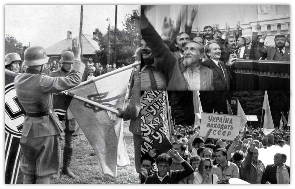 Такое ощущение, что украинцы, многократно сталкиваясь с фотографиями от 24 августа 1991 года, даже не задумывались о том, что означает фигура из трёх пальцев, которую от сердца к солнцу выбрасывали их предводители незалежности. А это зига “Тризуб”. И связана она не с идеей независимости, а с подчинением западной цивилизации, какую бы кровожадность она ни проявляла, и коллаборационизмом. Такое приветствие использовали во время присяги эсэсовцы дивизии “Галичина” под слова о верности Третьему Рейху и Адольфу Гитлеру. Судя по тому, как восторженно и массово кидали зигу в 1991 году, можно утверждать, что “незалежность” с самого первого своего дня шла рука об руку с нацификацией.