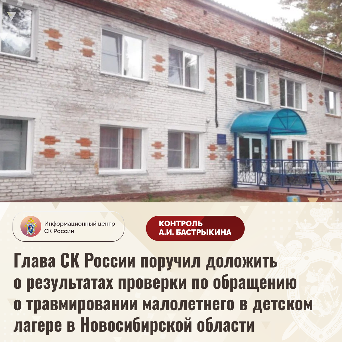 Глава СК России поручил доложить о результатах проверки по обращению о травмировании малолетнего в детском лагере в Новосибирской области В комментариях в телеграм-канале Информационного центра СК России обратилась жительница Новосибирской области по вопросу травмирования в июле текущего года ее семилетнего сына в детском оздоровительном лагере в Искитимском районе. Спальные места в учреждении не оборудованы специальными удерживающими устройствами и находятся в ненадлежащем состоянии, в результате чего ребенок упал со второго яруса кровати. Малолетний госпитализирован. Многочисленные обращения результатов не принесли. В СУ СК России по Новосибирской области по доводам комментария организована процессуальная проверка. Председатель Следственного комитета Российской Федерации Александр Иванович Бастрыкин поручил руководителю СУ СК России по Новосибирской области Евгению Геннадьевичу Долгалеву доложить о предварительных и окончательных результатах процессуальной проверки поставив ее на ко