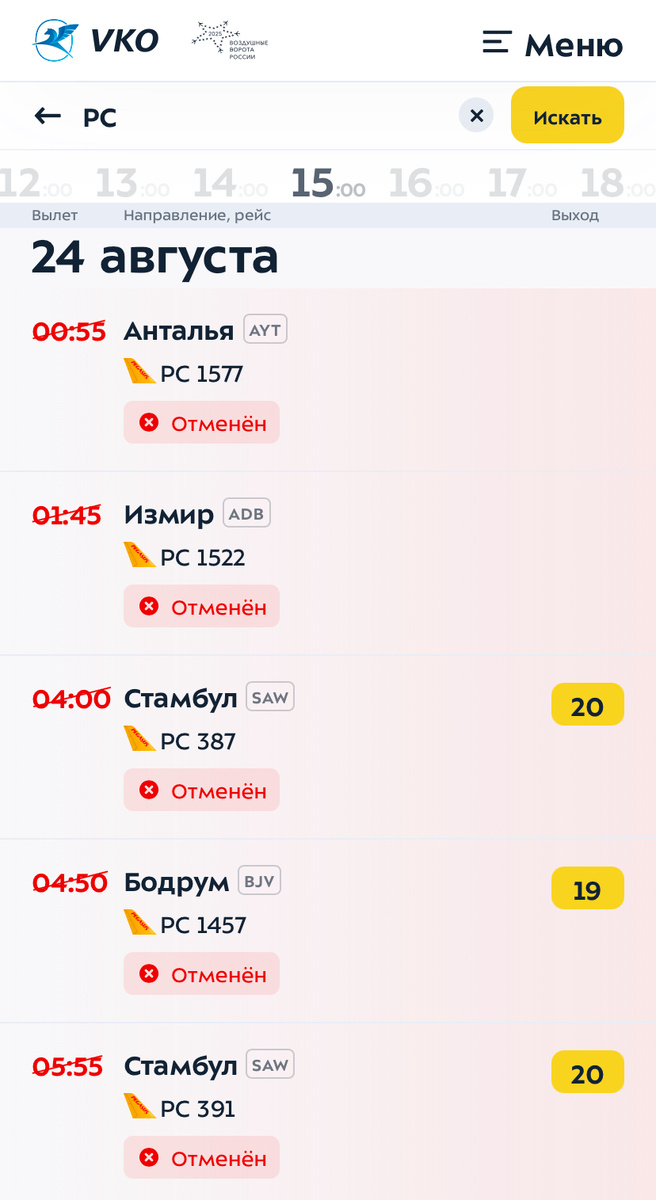 Речь о турецкой авиакомпании Pegasus, которая без объяснения причин взяла и отменила все вылеты из аэропорта Внуково. В воскресенье, точнее, в ночь с субботы на воскресенье! Что делать нашим людям? Привет, с Вами Елена. Отменены рейсы, начинающиеся с букв PC, например, PC 1577, который должен был вылететь из Внуково в 00:55 в Анталью. Не полетели, согласно расписанию, борта в Измир, Бодрум, Даламан, Стамбул (оба сегодняшних рейса). Неожиданно, Уважаемый Читатель, но причина такого поступка НЕИЗВЕСТНА! Турки молчат, не объясняя. Молчат и туроператоры, те, которые с “турецкими корнями”, например, Coral Travel. Ночью все люди спят, имею в виду турок. Всё хорошо у них со сном. Не спят только россияне, которые хотели бы мчаться в аэропорт, а некоторые уже помчались. НЕ спят и турагенты! Давайте будем объективными! План Ковер сегодня ночью во Внуково не объявляли, но объявляли в Самаре (Курумоч), Саратове (Гагарин), Нижнем Новгороде (Стригино) и еще в 9 аэропортах страны, а вчера в Шере