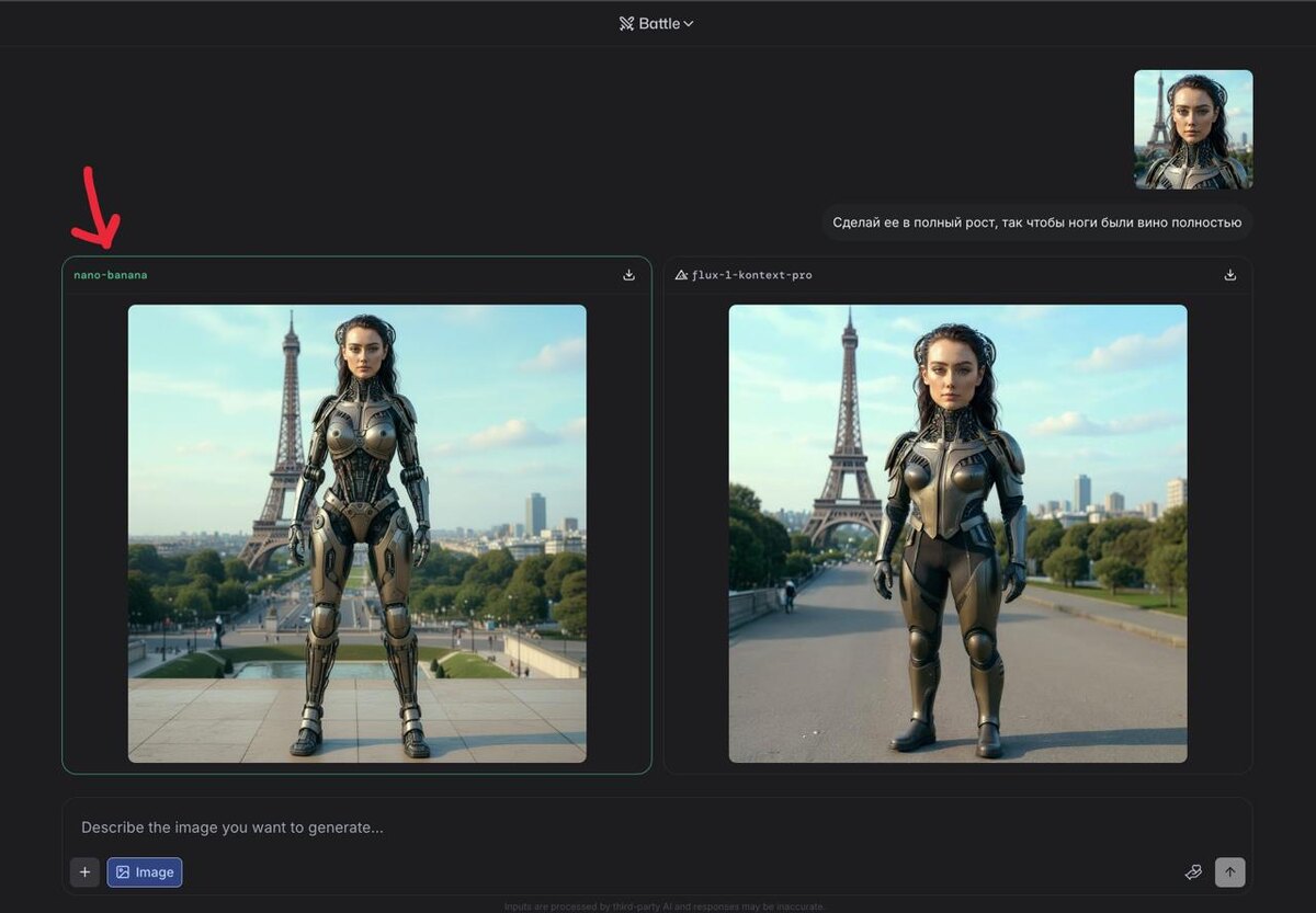 А теперь Nano Banana! Ходят слухи, что эта модель редактирования изображениый была создана в Гугл, и она просто разрывает всех конкурентов. И эта модель, она закрыта для тестирования, но ее можно заценить на лмарена! - просто загружаете изображение в чат, и пишите, как его нужно отредактировать. Возможно, потребуется несколько попыток, чтобы вызывать nano-banana. Как мы видим на скриншоте, нано банан просто поднял над головой и разорвал flux-1-kontext-pro с первого шота! Прощай Фотошоп! Больше не нужон! 🍌 https://lmarena.ai 🤖Saramudvlad | забустить 🤖