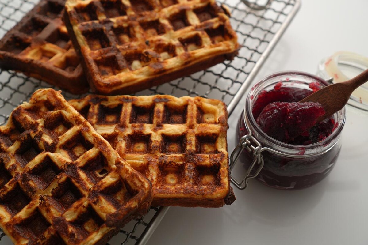 Я пекла на грилле DeLonghi с панелями для вафель бельгийских. Разогрев на 3, пекла 3 минуты, заполняла каждую ячейку так, чтобы не было видно выпуклостей. В итоге получилось 8 вафель около 50 грамм каждая.