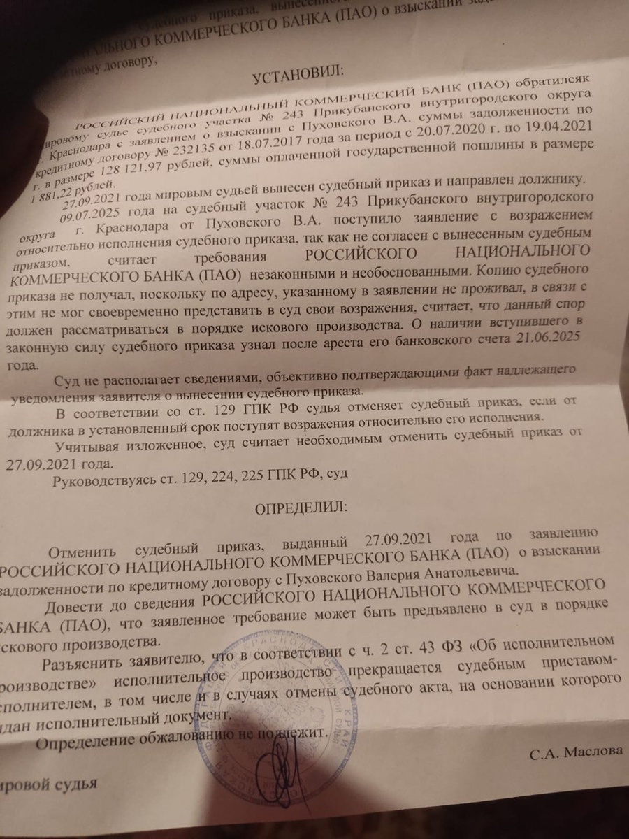 Здравствуйте. Хочу поблагодарить Вас за работу куратора Михаила Волочкова. Михаил сделал свою работу на отлично. Судебный приказ отменён. 👍