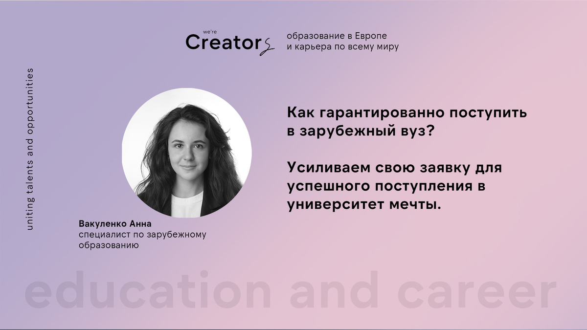 Со своими клиентами мы практикум такое правило: делать больше, чем от нас требуется. Это означает, что при поступлении в университет нам стоит мыслить более широко: чем мы еще можем удивить приемную комиссию? Где мы можем проявить себя неординарно, не так как большинство поступающих? Но конечно же стоит знать в этом меру. Данный тезис касается требований, мотивационного письма, портфолио: когда приемная комиссия видит, что человек подошел к вопросу серьезно, то у них просто не остается причин отказать. Смотрите и действуйте шире. А мы, если что – рядом.