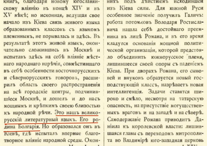 Это наш великий русский литературный язык. Его родина - Болгария. И сформировался он в Киеве, где впервые оказал благотворное влияние народного окружения. Наконец развился он в Москве, где он в звуке своей строю слился с живым языком русского народа.»