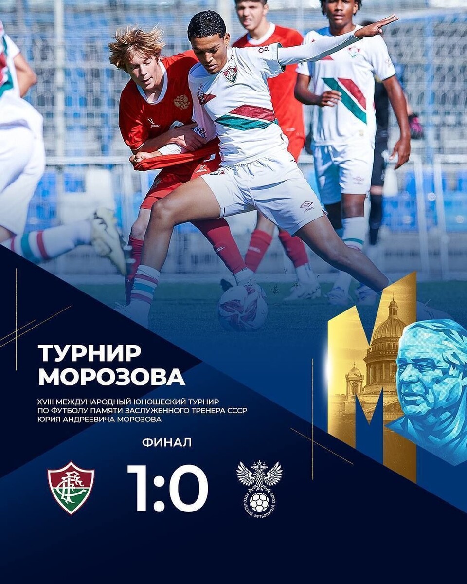 Бразильский «Флуминенсе» вновь выиграл международный футбольный турнир памяти Юрия Морозова, сообщает «Газпром»-академия ФК «Зенит». В академии ФК «Зенит» завершился 18-й международный турнир по футболу памяти заслуженного тренера СССР Юрия Морозова среди игроков не старше 15 лет. Хозяева соревнований в матче за бронзовые медали победили «Кайрат» из Казахстана. Основное время завершилось вничью – 1:1, а в серии пенальти точнее оказались зенитовцы – 7:6. В финальном матче встретились сборная России и бразильский «Флуминенсе». Южноамериканцы выиграли со счётом 1:0, тем самым став двукратными победителями турнира. Ранее сообщалось, что в Петербурге стартовал международный турнир по футболу в память о Юрии Морозове.