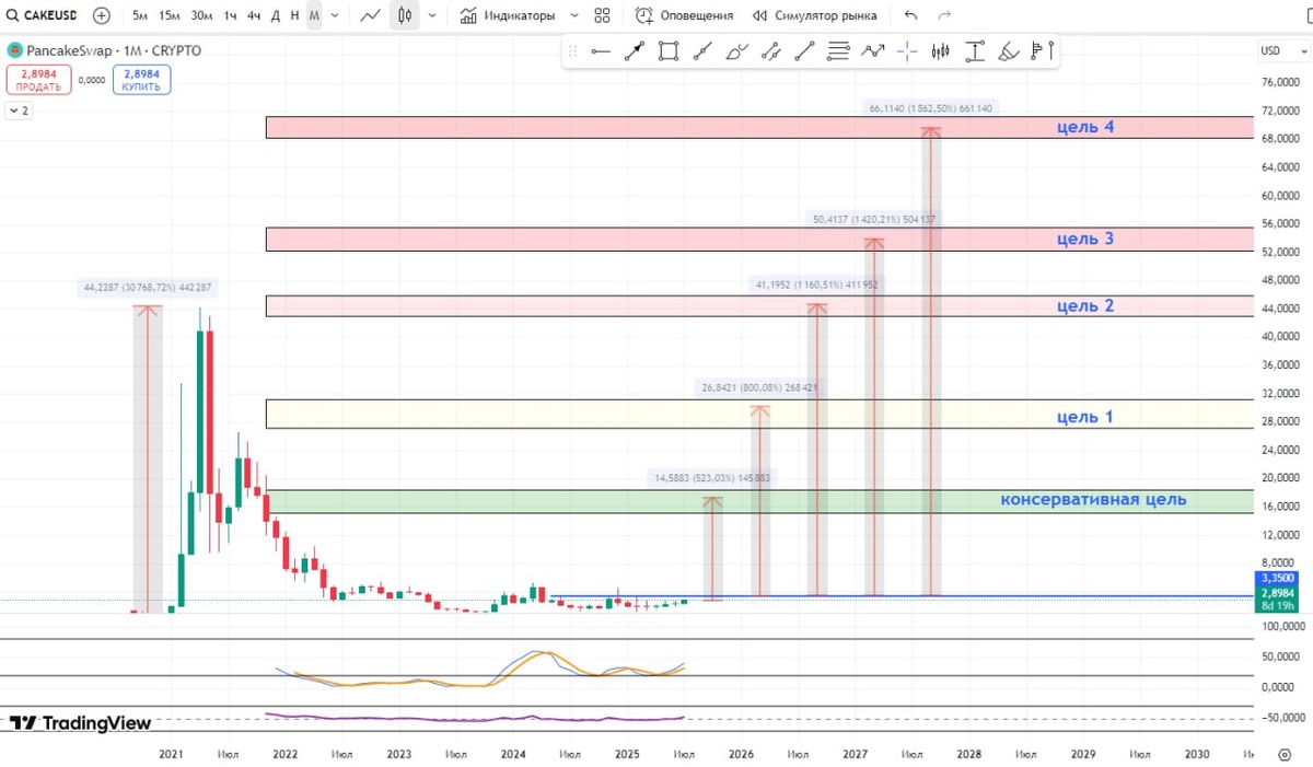 PancakeSwap (CAKE)🚀 Децентрализованная биржа, построенная на Binance Smart Chain. Токен можно получить за стейкинг, фарминг, участие в лотереях и других активностях. В предыдущем цикле показала рост более 300х👍 📌 Моя средняя точка входа на споте - $3.35 ✅ Консервативная точка фиксации находится в 500% от действующей цены. Можно полностью зафиксировать прибыль или забрать свои вложенные средства, оставив бесплатные монеты до следующих целей. 🎯 Моя пока цель начинается со второй. PS: 📈 По ходу роста и достижения целей буду обновлять информацию по каждой монете, а также сообщать о точках фиксации прибыли. 📌 Ищите интересующие вас монеты по хэштегам — например, #BTC ⚠️ Решения по покупке — только на вашей ответственности. Я делюсь своими знаниями и опытом, чтобы помочь найти выгодные точки входа и выхода. 💡 Инвестирую в монеты небольшой долей депозита с возможностью усреднения. Топ бирж, где я покупаю альткоины: ✅ Bybit ✅ Gate ✅ Bitget ✅ MEXC #PancakeSwap #CAKE #cakeusdt