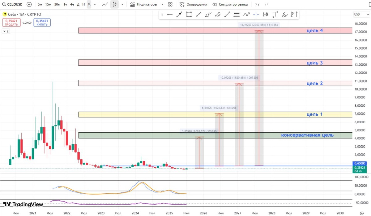 CELO🚀 Блокчейн-платформа децентрализованных финансов (DeFi), ориентированная на мобильные устройства. Пользователи могут выполнять операции, используя только номер телефона получателя. Инфраструктура Celo охватывает различных операторов связи и страны, обеспечивая глобальный доступ к финансовым услугам. 📌 Моя средняя точка входа на споте - $0.65 ✅ Консервативная точка фиксации находится в 1000% (10х) от действующей цены. 🎯 Мне интересны цели 1 и 2, далее посмотрим.👀 PS: 📈 По ходу роста и достижения целей буду обновлять информацию по каждой монете, а также сообщать о точках фиксации прибыли. 📌 Ищите интересующие вас монеты по хэштегам — например, #BTC ⚠️ Решения по покупке — только на вашей ответственности. Я делюсь своими знаниями и опытом, чтобы помочь найти выгодные точки входа и выхода. 💡 Инвестирую в монеты небольшой долей депозита с возможностью усреднения. Топ бирж, где я покупаю альткоины: ✅ Bybit ✅ Gate ✅ Bitget ✅ MEXC #CELO #celousdt