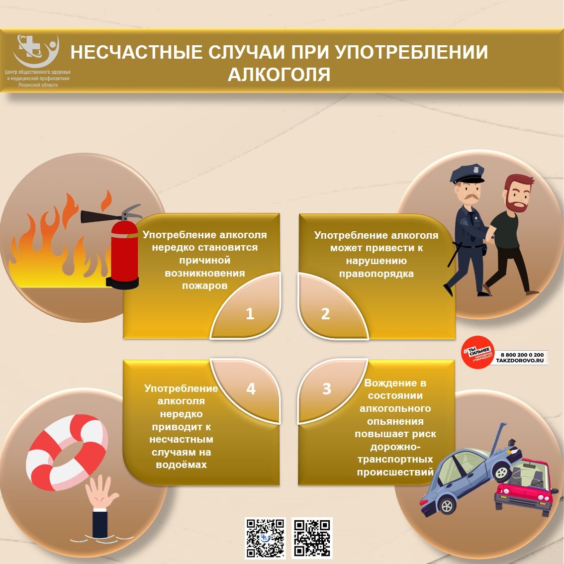 ⌛ Подошла к концу неделя отказа от алкоголя. 🚨 Алкоголь – частая причина смерти и увечий на рабочем месте, в ДТП, при пожарах и даже дома. В списке причин несчастных случаев разной степени тяжести алкогольное опьянение всегда занимает лидирующие позиции. Алкоголь прежде всего действует на организм угнетающе: ◾ Замедляет скорость реакции; ◾ Нарушает чувство равновесия и координацию движений; ◾ Ухудшает зрение и слух; ◾ Повышает сонливость; ◾ Нарушает способность здраво рассуждать и адекватно оценивать ситуацию вокруг. #НеделяТрезвости #АлкоголюНет #ЗдоровоеБудущее62 #ЗдороваяРязань