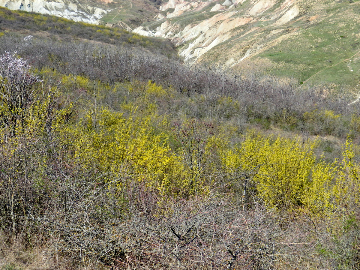 Вот к тем глиняным склонам мы идем. Все, желтое — это цветущий кизил. Наконец-то мы выбрались из зарослей. Уже начинаются загадочные склоны, хотя это еще не мое место. Я уже несколько раз показывала это место. Даже и не знаю что еще говорить о нем. Об этих глиняных склонах. Почему он разноцветные? Почему то красные. То белые. То серо-голубые. Иногда смотрятся остатками карьера. Иногда кажется, что кто-то вырезал фигурки. А иногда просто фантастические пейзажи окружают тебя! Я же шла за кизилом! Весь склон горы за моей спиной, до самого верха, в марте, иногда еще в феврале становится желтым. И ты радуешься, что столько много кизила растет совсем рядом с домом. Ты тоже желтый. Но, ты адонис! Теперь, наконец-то мы подходим именно к тому месту, что я направлялась изначально. Эти склоны смотрятся еще загадочнее. Еще не реальнее. Мда… Вид гаражей, стоящих на верхушке отрога портят всю фантастику! А через дорогу уже начинается жилой район. Прогулка получилась немного сумбурная. Зато