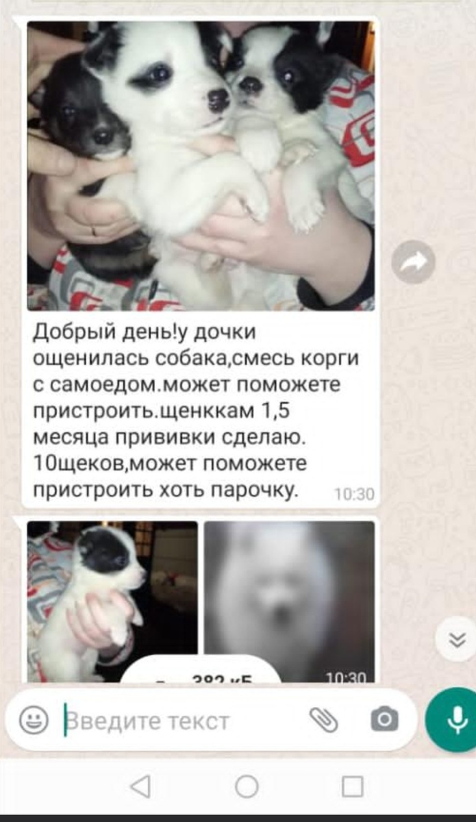 История Юны началась с "развода" на Авито. Некий мужчина из Курска подал объявление о 10 щенятах, метисах Корги и Самоеда. На фото красовались симпатичные малыши черно-белого окраса.