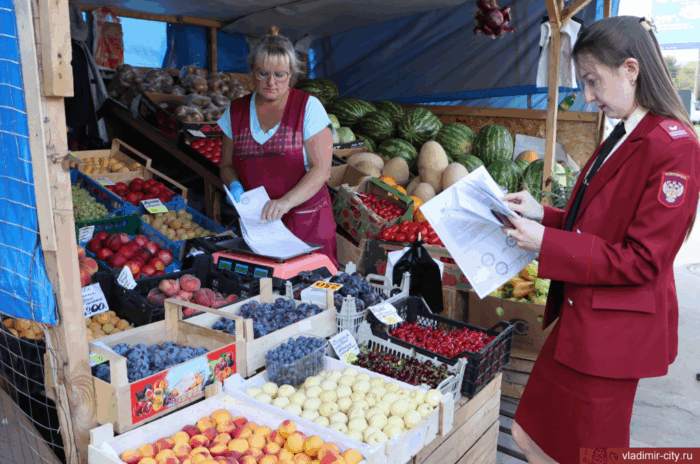 Замечательно, что у нас есть рынок во Владимире, где можно купить свежие овощи-фрукты у владельцев садов-огородов: все свежее, прямо с грядки да и, надеемся, без химикатов – экологичное. Это на рынке, что на улице Егорова в Добром. Как раз, этот стихийный рынок на улице Егорова в начале августа текущего года и проинспектировал владимирский «Народный фронт» совместно с Роспотребнадзором. Проверяющие выявили немало нарушений. Скриншот видео: vk.com/nf_33 После этого представители Владимирского центрального рынка и сотрудники управления Роспотребнадзора по Владимирской области провели выездную консультацию на территории плодово-овощной ярмарки на улице Егорова в районе дома № 8. Проверяющие хоть и выявили нарушения у сезонных торговцев, но в администрации города, считают, что плодоовощные рынки востребованы и их не нужно убирать с проходных мест на улицах города. Фото: vladimir-city.ru Управление по связям с общественностью и СМИ разместило на официальном сайте материал по итогам выездног