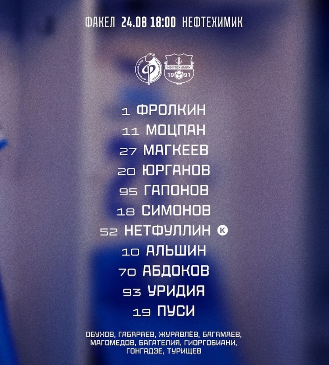 Футболисты воронежского «Факела» начинают матч 6-го тура Первой лиги против нижнекамского «Нефтехимика». Главные тренеры выбрали следующие игровые сочетания своих команд: «Факел»: Фролкин, Моцпан, Магкеев, Юрганов, Гапонов, Симонов, Нетфуллин, Альшин, Абдоков, Уридия, Пуси. «Нефтехимик»: Голубев, Валиахметов, Толстопятов, Ширяев, Ситдиков, Сухомлинов, Родин, Моисеев, Шадринцев, Шильцов, Магомедов.