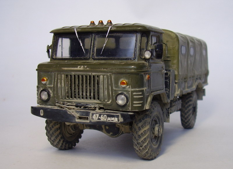 ГАЗ-66 Андрей Восточный экспресс, 1:35 ================================ Попытка придать дровам от ВЭ более-менее приличный вид. Дорабатывал до позднего варианта. Сборка с применением травления от неизвестного производителя(подозреваю что это Интеравиа) и такой-то матери.Помимо травления доработано: Передний бампер и сделаны подножки перед кабиной, трос, повторители поворотов и огни автопоезда, облицовка радиатора переделана под позднюю, тент, задие фонари.В кабине сделан переключатель поворотов и плафон освещения, колеса. Колес от MIGа в зоне досягаемости не обнаружилось, пришлось ставить родные, правда постарался их немного облагородить. Ходовую практически не трогал, а то еще бы пол-года пилил :-) Получилось немного коряво, но пока как смог... =============≠================= ================================