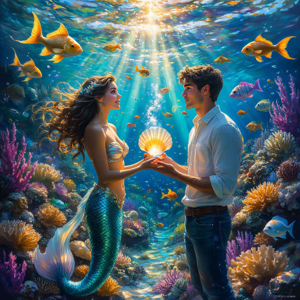 Элэй всегда чувствовал, что его жизнь слишком серая. Он работал в маленьком архиве, где пыльные книги и старые карты были его единственными спутниками. Но однажды, разбирая древний свиток с изображением океана, он нашёл странный ракушечный амулет. Как только он прикоснулся к нему, комната наполнилась сиянием, и вода хлынула из ниоткуда, унося его в глубины. Очнулся он в месте, где солнце пробивалось сквозь толщу воды, окрашивая всё в бирюзовые и золотые тона. Коралловые дворцы переливались, как драгоценности, а рыбы всех цветов радуги танцевали вокруг. Это был Аквилория — подводное королевство, где магия была частью каждого дня. Первым, кого он встретил, была Лира — юная русалка с серебристой чешуей и глазами, полными доброты. Она не испугалась странного существа без хвоста, а наоборот, предложила помощь. Лира рассказала, что амулет, который принёс Элэй, — это Ключ Гармонии, артефакт, способный усиливать магию океана. Но он был утерян много лет назад, и без него рифы начали тускнеть. В