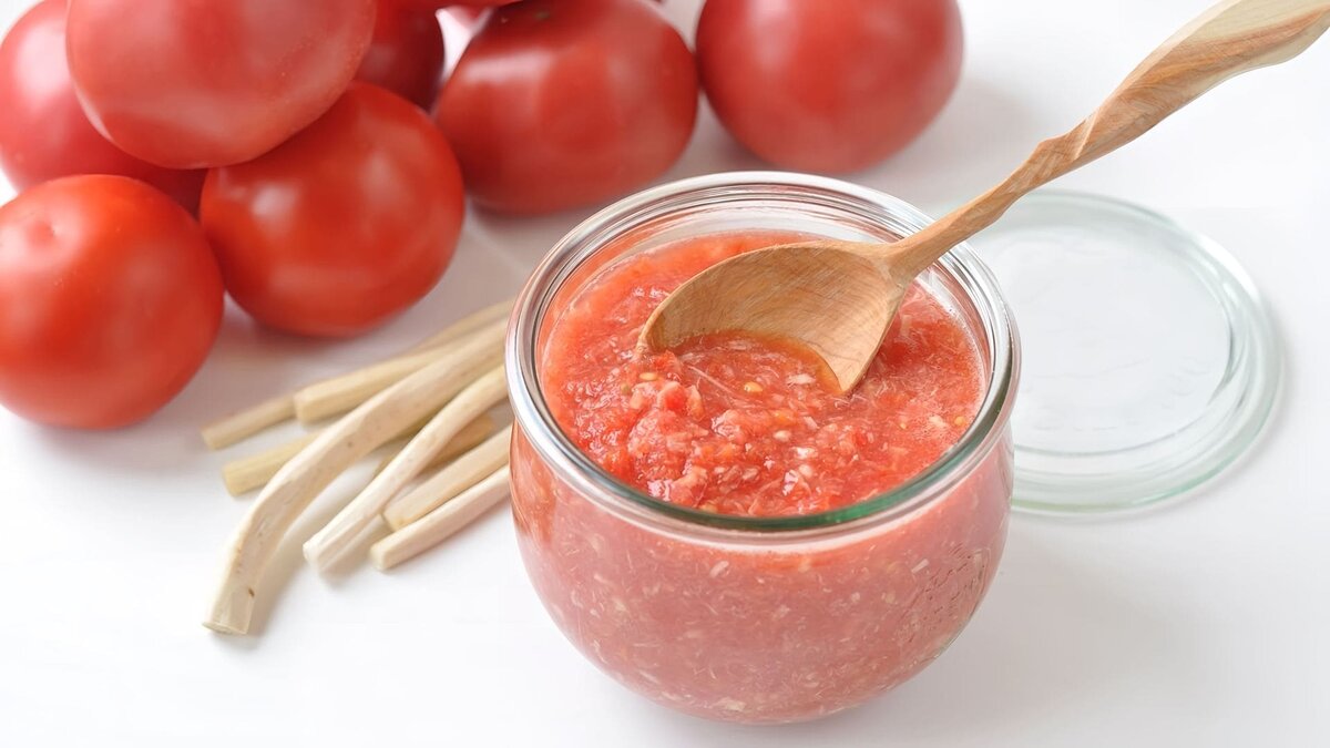 Хрен измельчаем ножом, затем пропускаем через мясорубку. Добавляем измельчённые помидоры и чеснок. Перемешиваем, раскладываем по стерилизованным банкам. Ингредиенты: Приготовление: