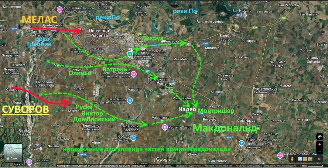 Зелеными стрелками показаны назначенные маршруты поспешного отступления франц.войск от Треббии