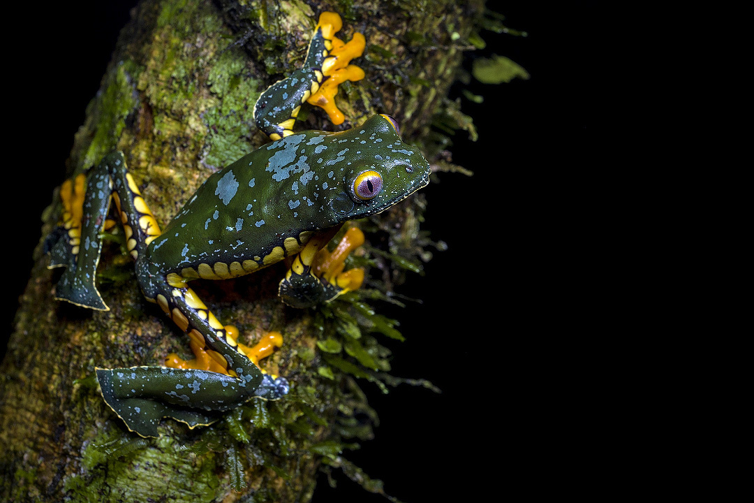 Привет, мои дорогие любители необычной земной фауны — давайте перенесёмся в амазонскую ночь, туда, где джунгли хранят тысячи глаз, и вдруг один прыжок с кроны рассыпает перед вами вспышку цвета, будто джунгли сами зажгли фейерверк. Вы застываете: из листвы вылетает небольшое существо, распластывая лапы так, что между пальцами раскрываются широкие перепонки. В темноте они горят оранжевым, и кажется, будто в воздухе промелькнул крошечный парашют. Наш герой — причудливая квакша (Cruziohyla craspedopus), редкая древесная лягушка из семейства квакш. Латинское название намекает на её лапы: craspedopus переводится как «бахромчатая стопа», и действительно, её перепонки настолько велики, что превращают прыжок в планирование. Ареал причудливой квакши охватывает влажные тропические леса Амазонии: Эквадор, Перу, Колумбия, Бразилия и Гвиана. Она живёт высоко в кронах деревьев, почти не спускаясь на землю, и потому встретить её — большая удача. С виду это настоящий лесной витраж: зелёная спина с бел