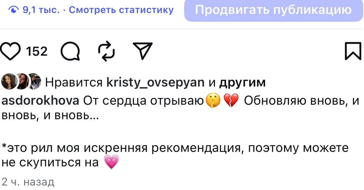 * - психанула🤣🤡 Правда… либо это инст, либо я теряю связь… даже с лайками ж🍑па😒 Чтобы ни делала: хоть пользу, хоть кринж подавай - ноль реакций💔 Думаю: 1. реклам впереди нет - можно забить и уйти с головой в тик ток🤘🏻, новая аудитория - новая жизнь 2. многие жаловались на рекламы… я прочекала все таблицы - рил чаще раз/3 дня не было! Они - не аргумент! + посмотрела «коллег» с пресс-тура… да я в АФИГЕ, рекламы каждый день, да не одна🫠 и никто не жалуется! Пока (после поездки) прет вдохновение, будут пилить по 2-3 видео в день… но если я выгорю и покину вас к сентябрю))) вы знаете причину!🫠 + ещё сюда готовлю посты про Мск, влог на ютуб🤯🤯