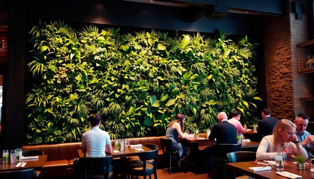 3. Яркий акцент. Фитостена служит главным украшением интерьера. Она выделяет кафе среди других и делает его стильным и современным.