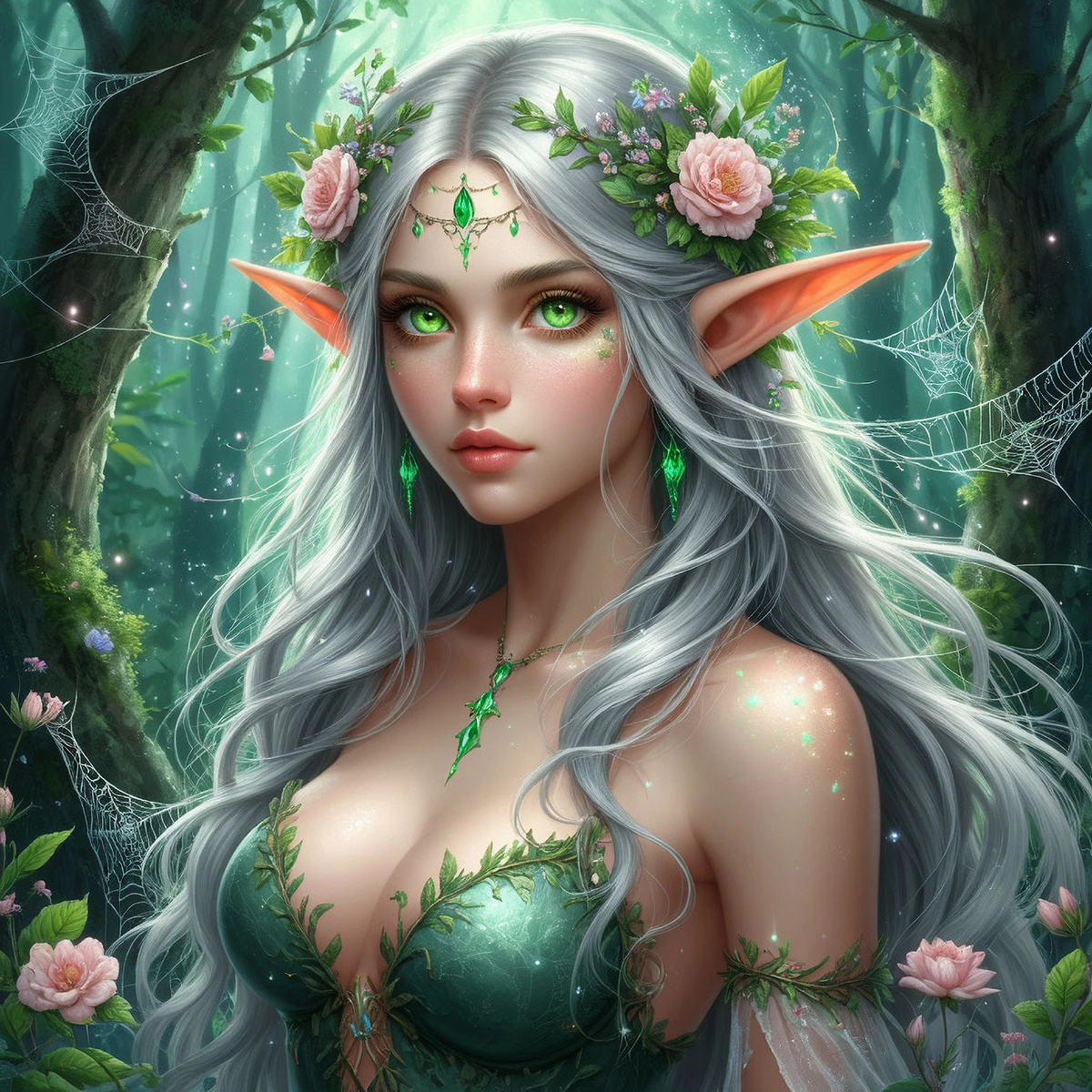 > `1girl, портрет красивой эльфийки с длинными серебряными волосами и светящейся кожей, нежные зеленые глаза, в венке из живых цветов и паутинки, волшебные сияющие частицы, в магическом лесу, мягкое фэнтези, арт в стиле Генсеина и Россетранса, высокая детализация, пастельные тона, этhereal beauty`
