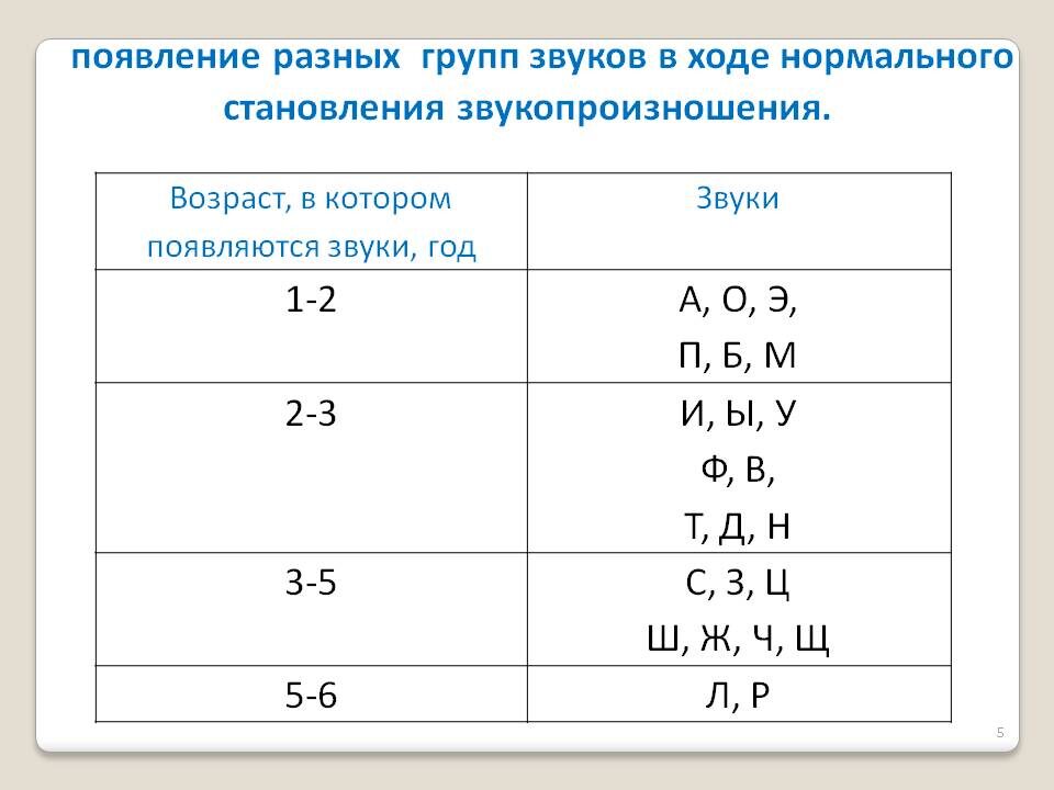 Правильное произношение звуков чрезвычайно важно. И чаще всего родители это понимают. Но не всегда могут объективно оценить, когда пропуски и замены звуков в речи их малыша являются возрастной нормой, а когда нужно срочно предпринимать меры по исправлению ситуации. В результате часто случаются перегибы то в одну, то в другую сторону: либо двух-трехлетнего малыша настойчиво учат «рррычать», либо упорно не замечают «каши во рту» пяти-шестилетнего ребенка и считают, что он сам «выговорится». Чтоб таких крайностей не случалось, родители должны знать примерные сроки появления звуков речи: 1 - 2 года: а, о, э, п, б, м; 2 - 3 года: и, ы, у, в, ф, т, д, н, г, к, х; 3 - 4 лет: с, з, ц; 4 - 5 лет: ш, ж, ч, щ; 5 - 6 лет: л, р. До трех лет возрастной нормой считается смягчение согласных звуков («сяпка» вместо «шапка», «дём» вместо «дом» и т.д.). Все остальные звуки малыш в этом возрасте, как правило, не произносит совсем (пропускает) или заменяет на более простые (вместо «мишка» ребенок может прои