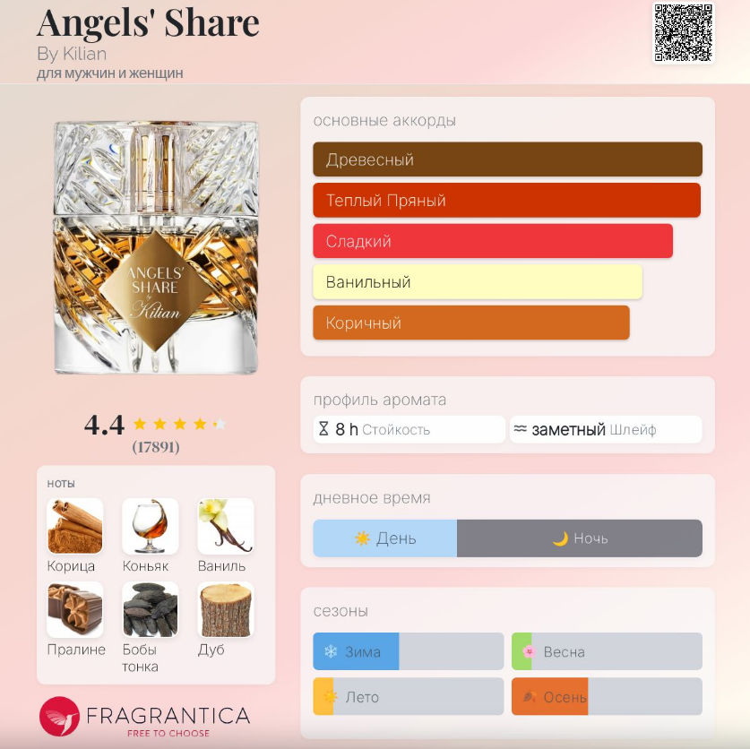 ✅ Качество исполнения — стойкость и проекция очень близки к оригиналу, а иногда даже превосходят Цены не привязаны к конкретному магазину и являются средними по рынку России. 🌿 Оригинал: Angels' Share By Kilian