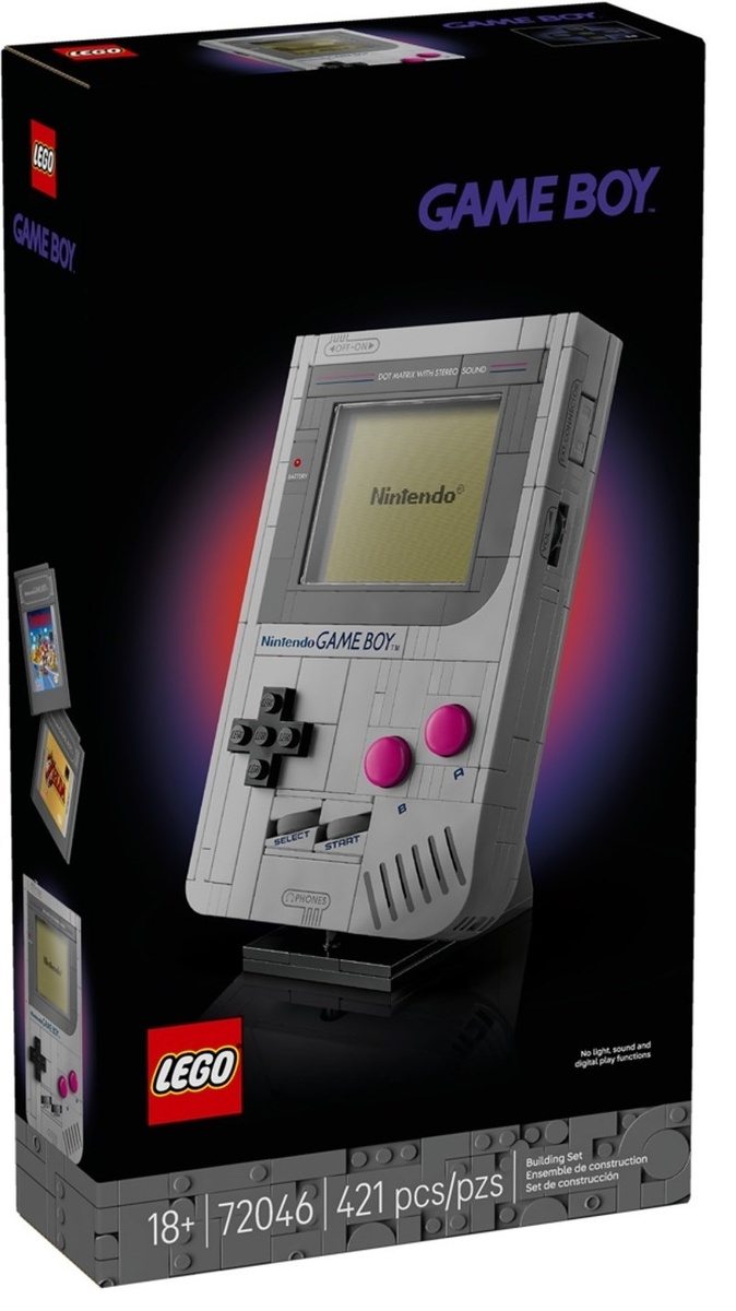 Привет-привет! Сегодня рассмотрим очень скромный по размерам, но абсолютно точно «флагманский» коллекционный комплект. Номинально в The Lego Group его отнесли к серии Super Mario, но фактически он расширяет коллекцию игровых приставок, которые до этого были представлены наборами №71374 «Nintendo Entertainment System» и комплектом №10306 «Atari 2600». Предыдущие наборы существенно больше рассматриваемого сегодня, однако Геймбой серьёзно расширяет возможности дальнейших коллабораций, которые не заставят себя ждать. А вот и коробка от набора, и он весьма скромен по размерам – всего 421 деталь! В названии скромно отсутствует слово «Nintendo», хотя формально именно оно должно превалировать, ведь «Гейм Бой» не самостоятельная единица. А вот, что представляет из себя сама готовая модель: сама портативная игровая консоль (которая кстати появилась в Японии в 1989, а прекратили поддерживаться в 2003), несколько сменных дисплеев и парочка картриджей. Почти на всех снимках презентации TLG подчёрки