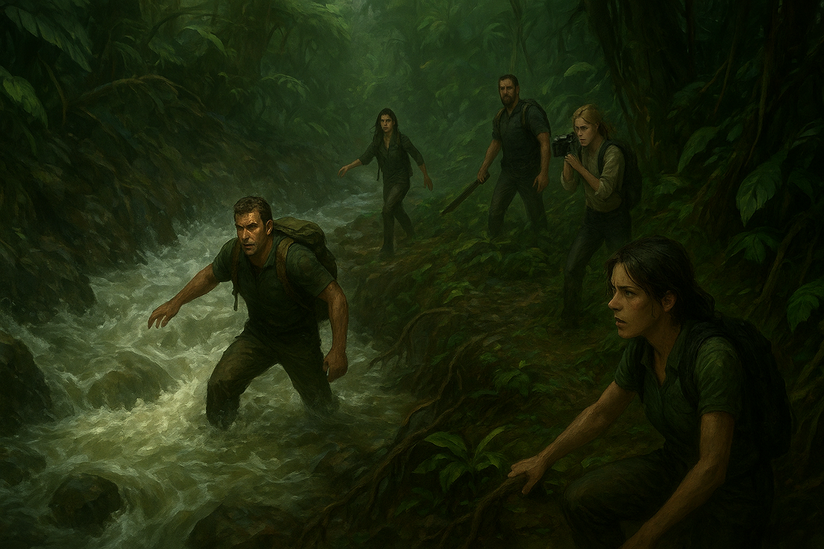 Воздух стал другим. Не просто влажным — густым, обволакивающим, словно джунгли втягивали их глубже в свои лёгкие. Свет пробивался сквозь купол листвы уродливыми зелёными пятнами, а тропа под ногами расползалась в чёрную, дурно пахнущую жижу.